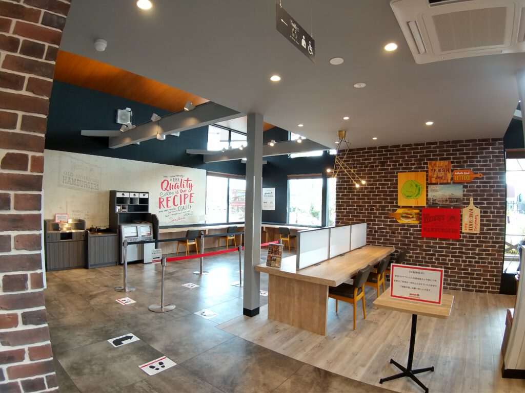 岩出店は建物から新築する、First kitchenにとって初のドライブスルー店。この店舗は天井が高く明るく開放的な内装と、ドライブスルー部分まで大屋根で覆うダイナミックな外観が特徴である。岩出の山々を望む2階テラス席や、ペット連れでも利用出来るテラス席、ゆったりしたキッズスペースなど、幅広い方々の利用に合わせた客席が計画されている。